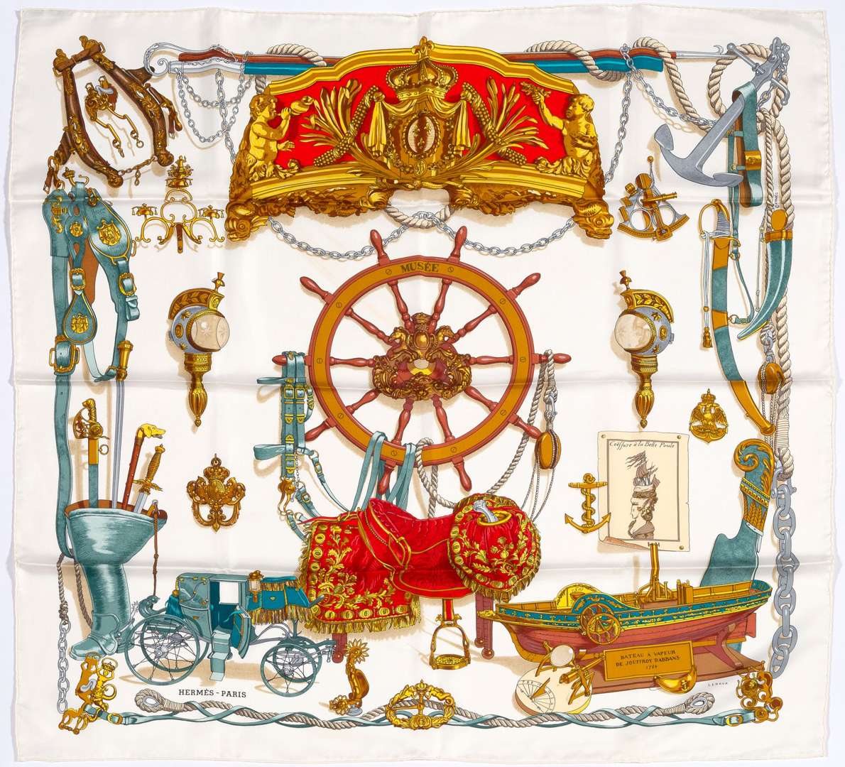 Carré de soir dessiné par Philippe Ledoux, dans les tons bleu, rouge et blanc