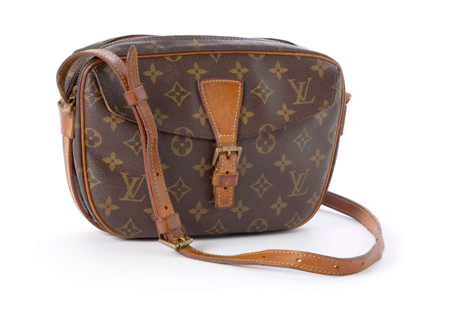 Sac en toile monogrammé et cuir naturel. Anse à bandoulière ajustable.