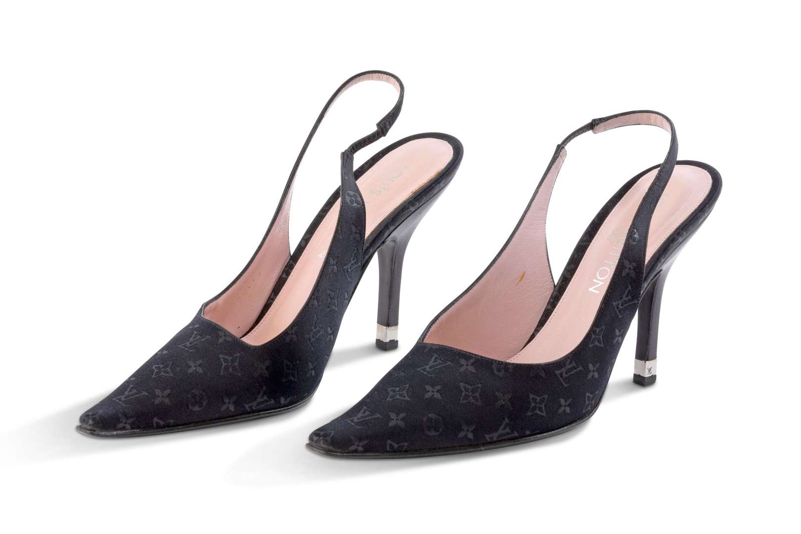 Paire d'escarpins slingbacks en tissu satiné monogrammé.