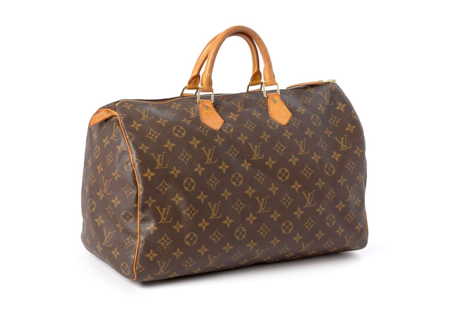Sac en toile monogrammée et cuir naturel. Double-poignée et garniture en métal doré.