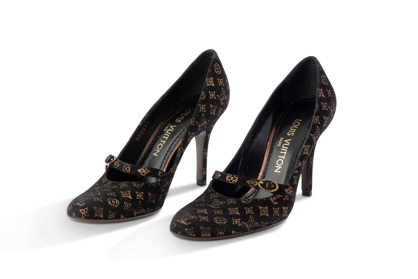 Paire d'escarpins à brides en cuir nubuck noir, monogram doré.