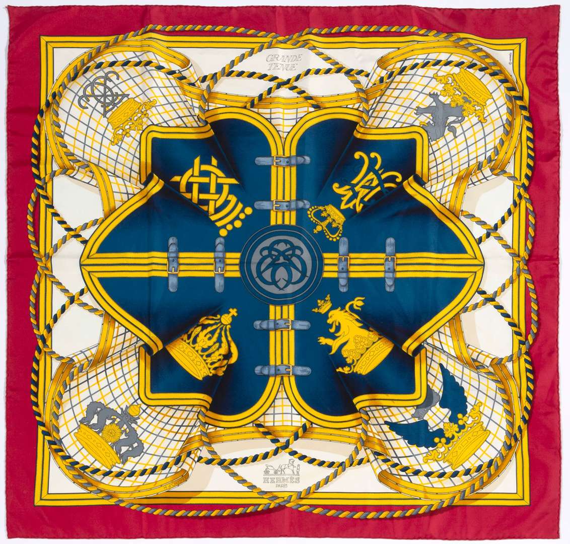 Carré de soie dessiné par Henry d'Origny, dans les tons bleu et jaune, encadré bordeaux.