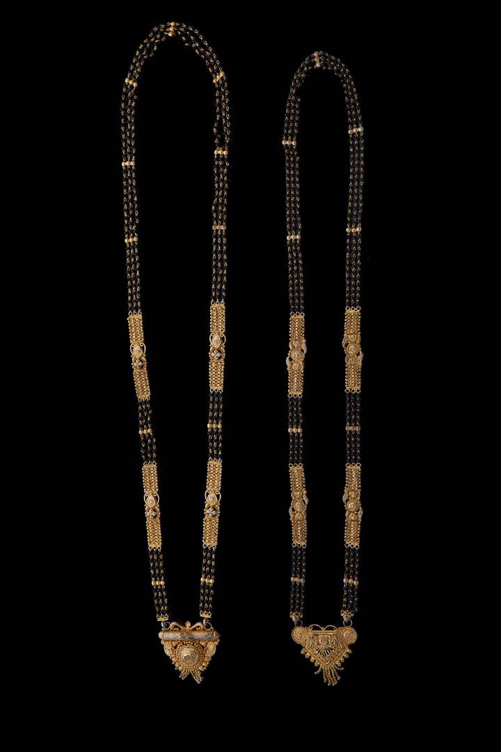 Deux long colliers à pendants filigranés dorés et perles noires alternées.