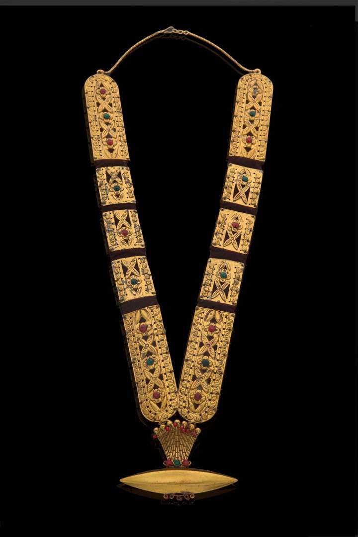Monté sur un collier formé de plaques en repoussé à motifs géométriques cousues sur une base textile.