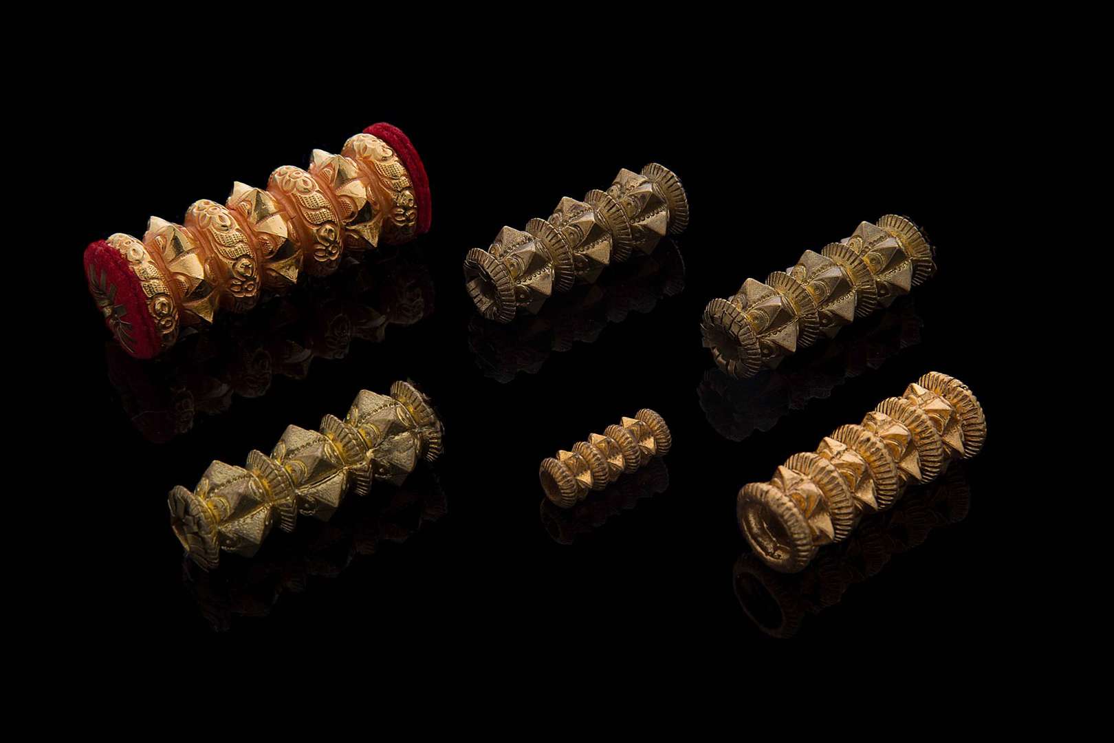 Longue perle tilahari en or 22k et en métal doré. De forme cylindrique alternant bagues à motifs floraux et bagues de forme étoilée.