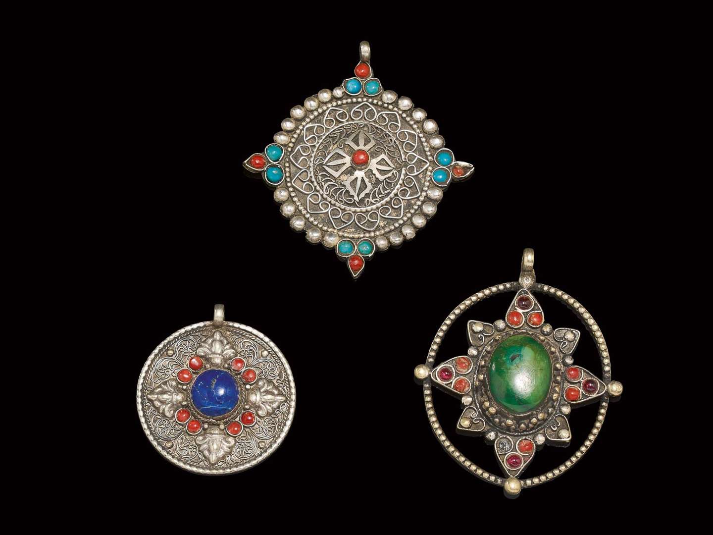 Ensemble de trois pendentifs filigranés rehaussés de pierres colorées.