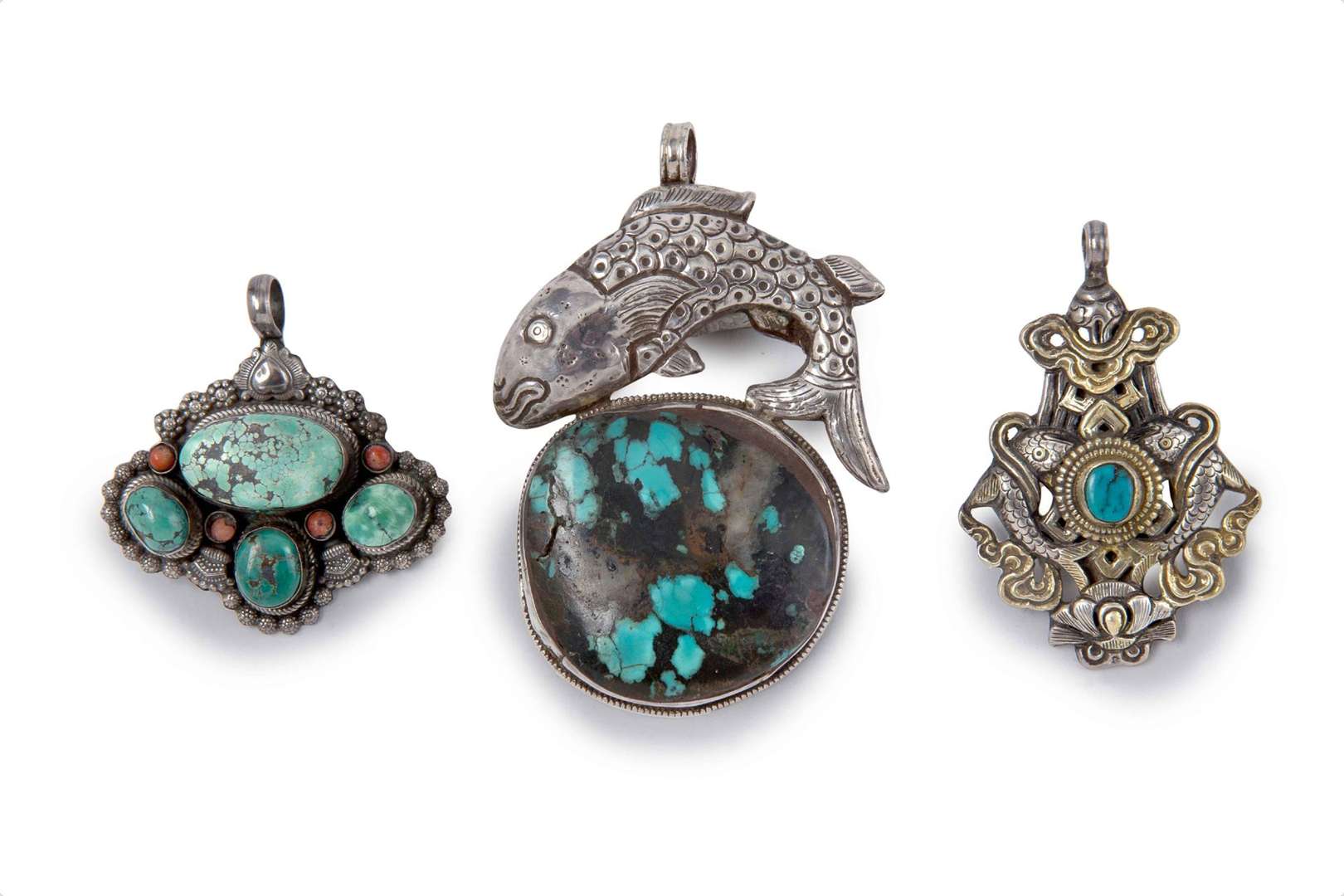 Ensemble de trois pendentifs en argent et turquoise.