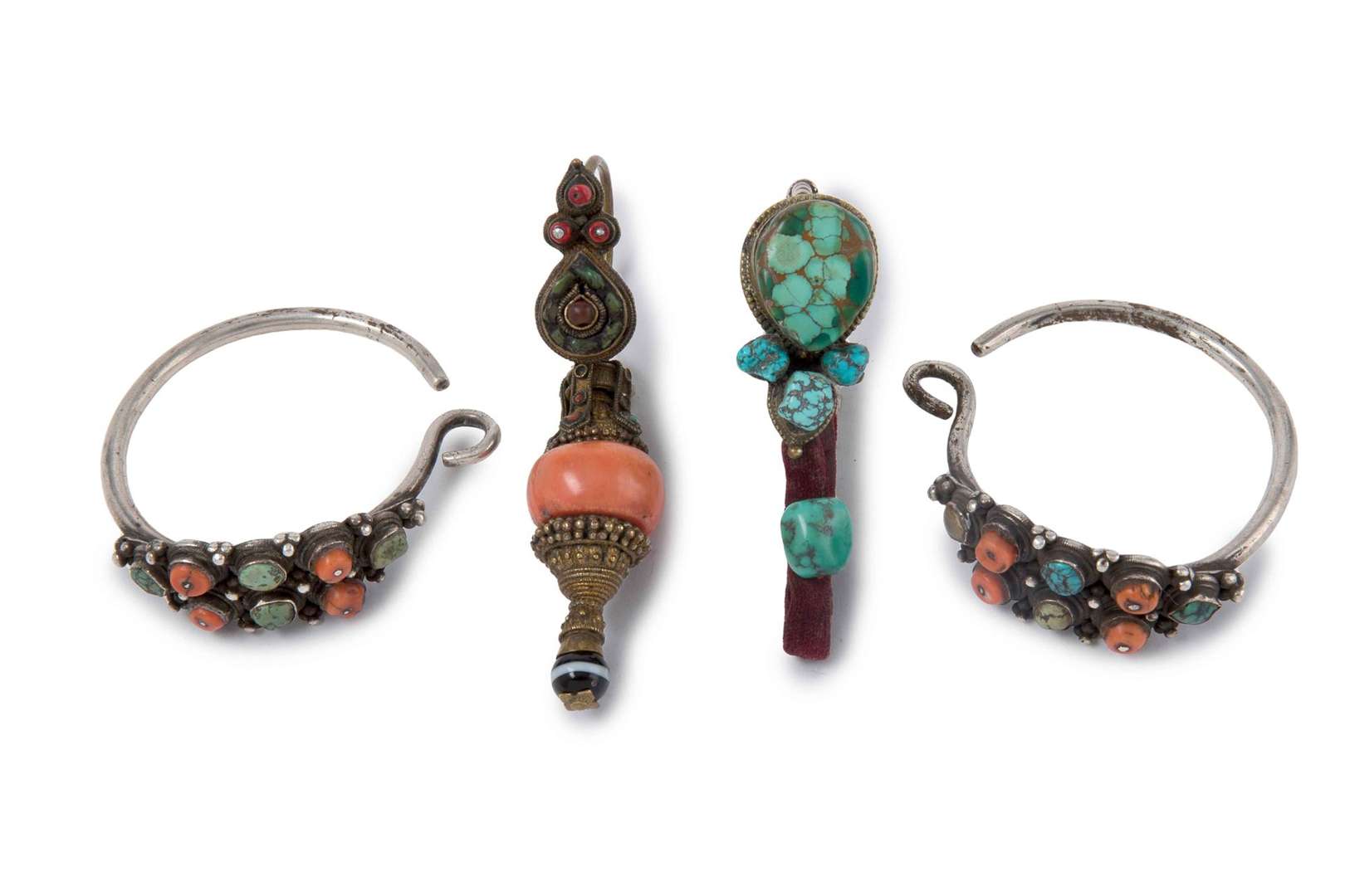 - Une grande paire d'anneaux en argent et cabochons de turquoise et corail.