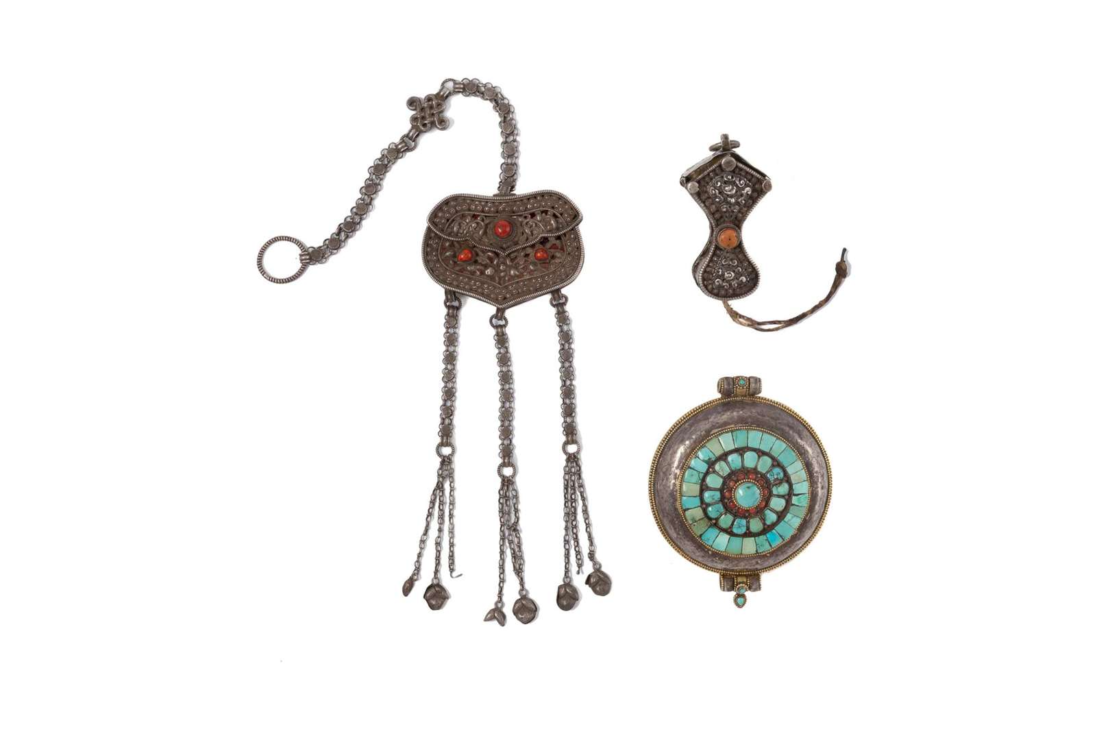 L'une avec des incrustations de turquoise, les deux autres en repoussé avec des cabochons de pierres variées.