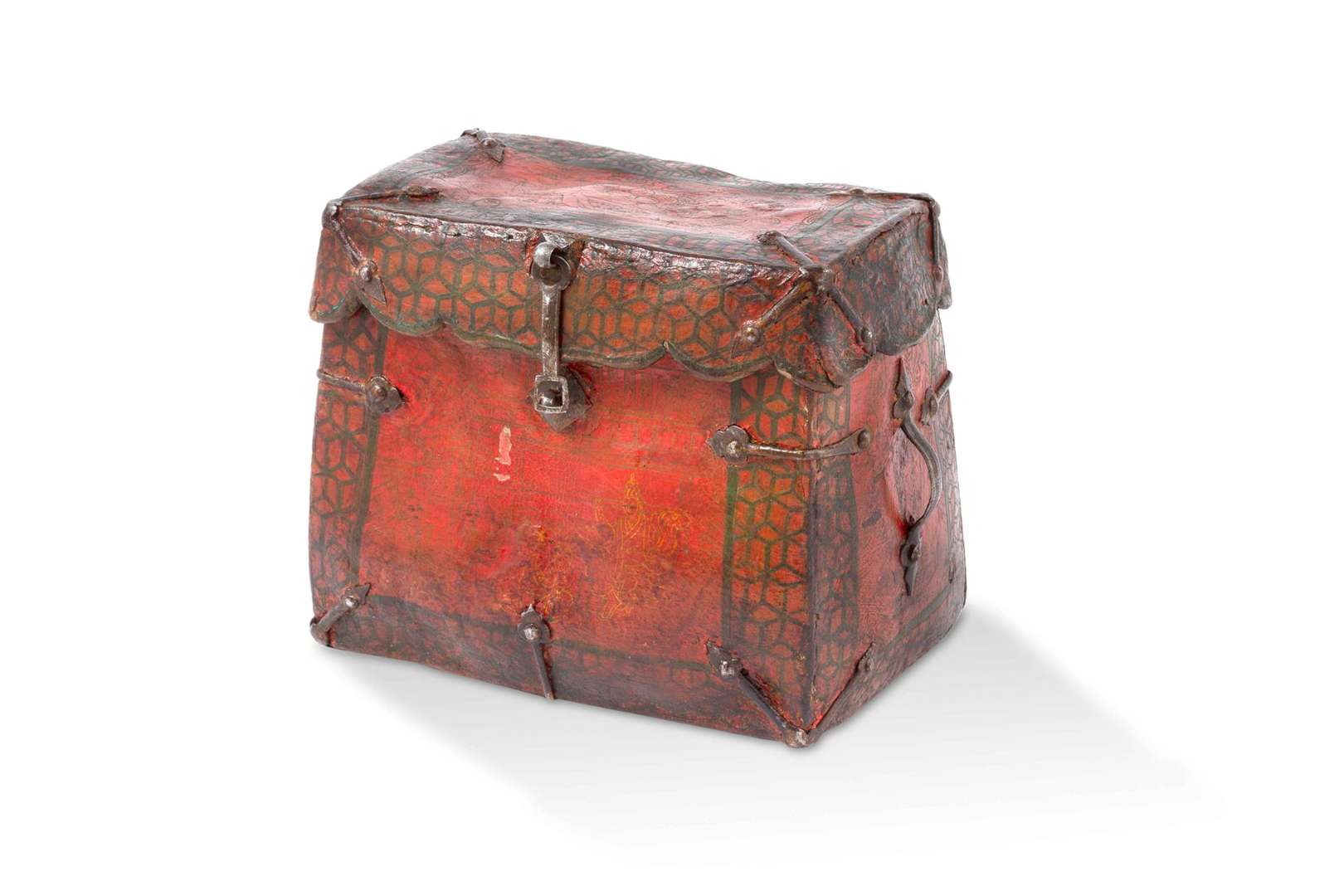 Sac de pélerin en cuir rouge peint et ferrures.