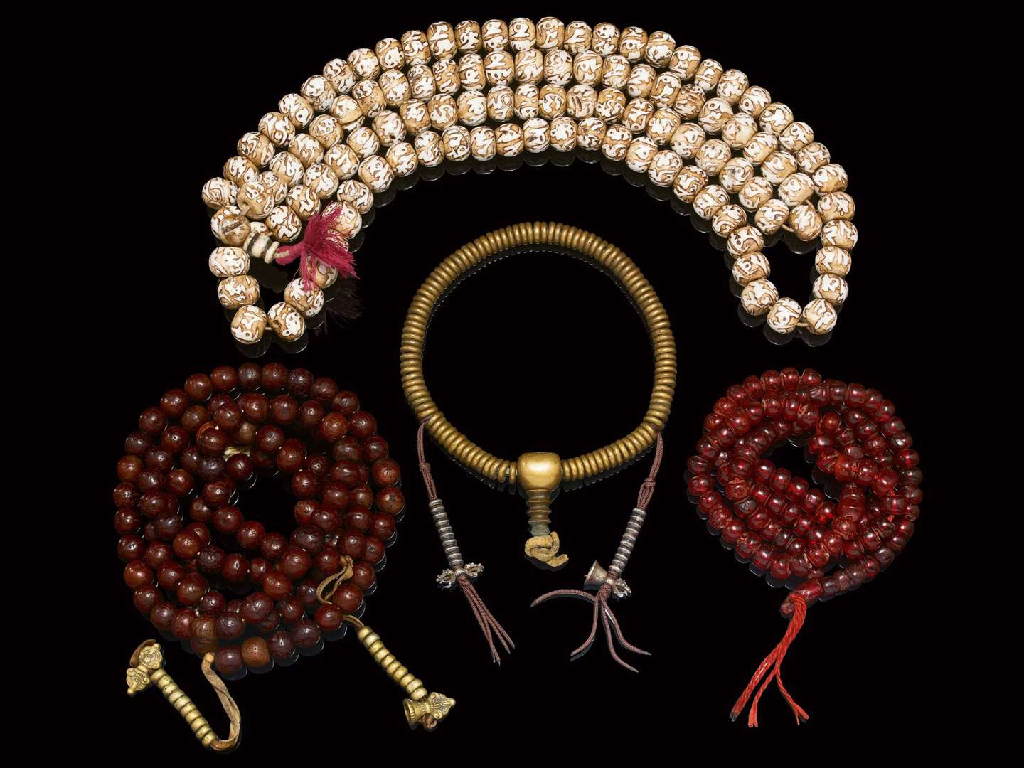 Dont un en graines, un en perles de laiton, un en perles d'ambre rose et un en perles de tridacna.