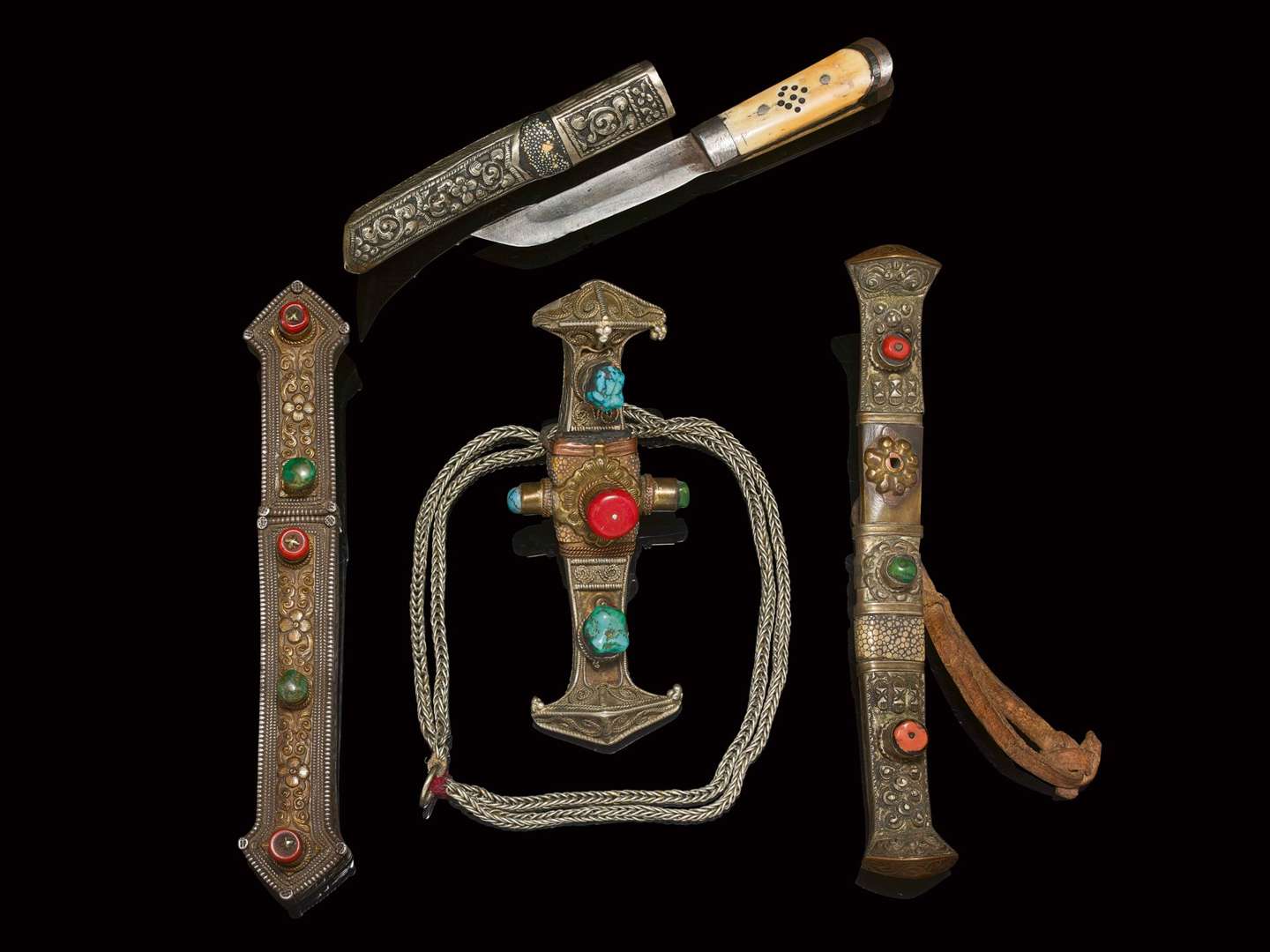 Ensemble de quatre petits poignards et leurs fourreaux en argent repoussé et métal argenté