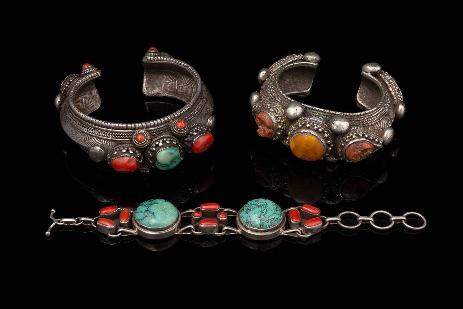 Ensemble de deux bracelets manchettes en argent, métal argenté et cabochons de pierre de couleurs.