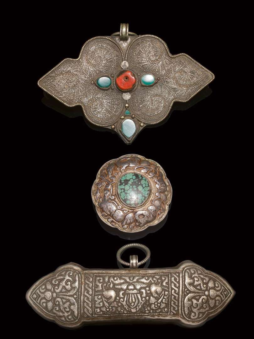 L'une en filigrane et incrustations de pierre, l'autre à décor d'oiseaux et rinceaux, la dernière avec un large cabochon de turquoise et des animaux en repoussé.