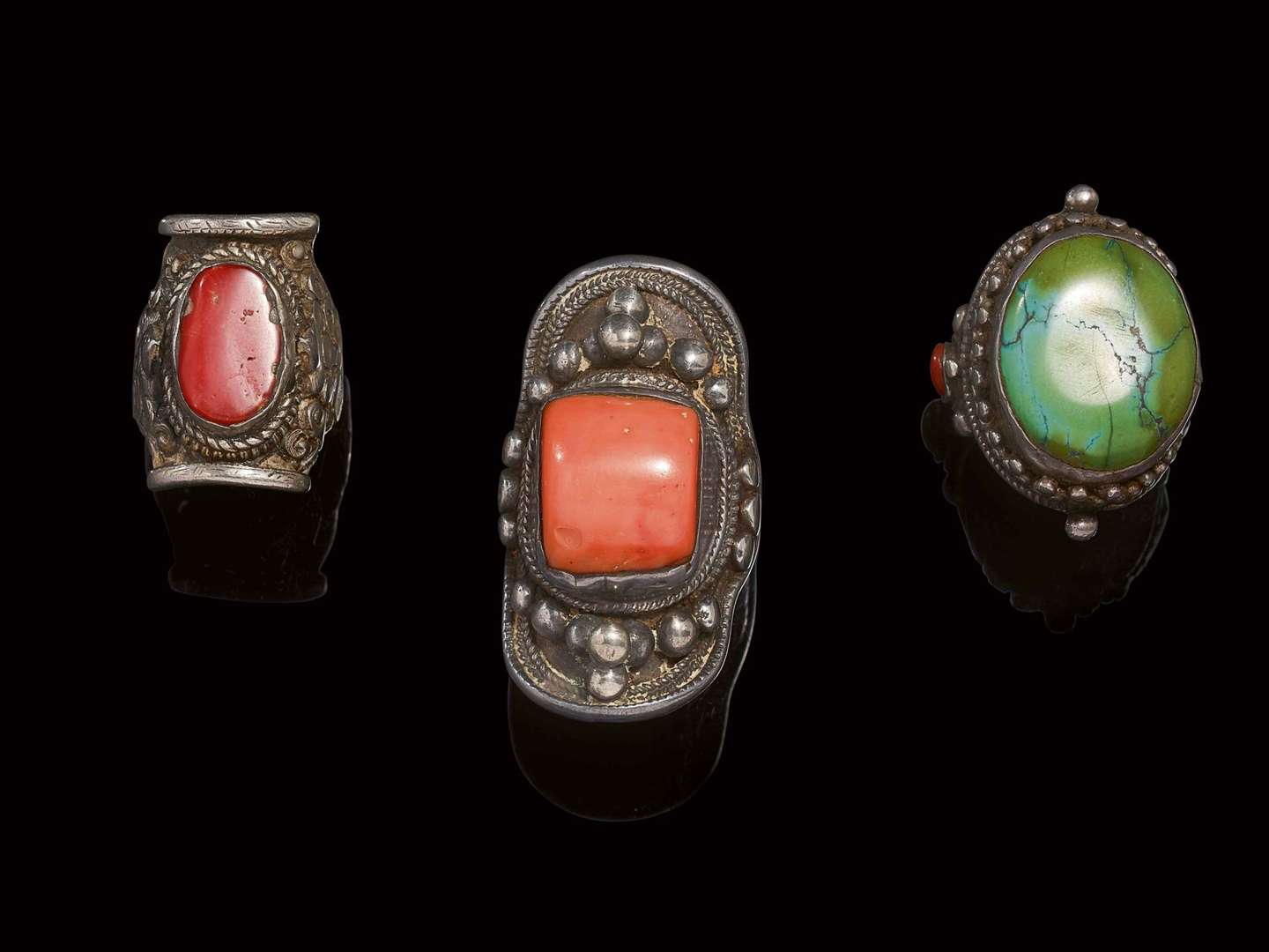 Deux ornées de cabochons de corail et une avec une turquoise.