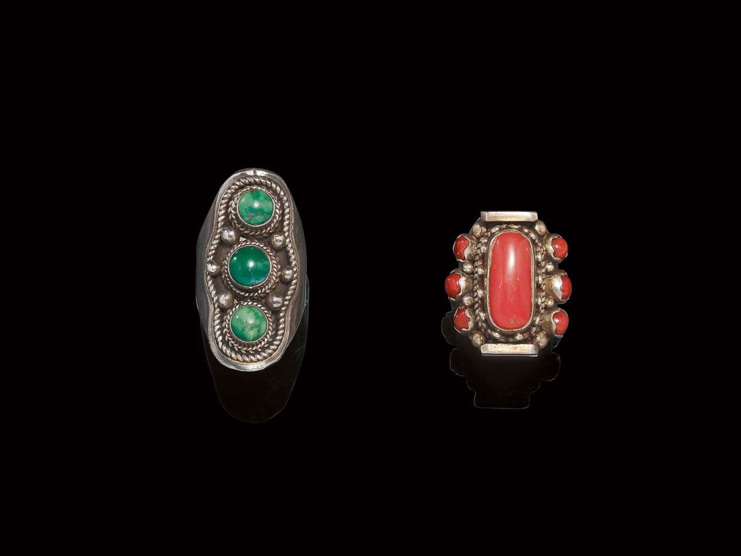 L'une ornée de trois pierres vertes et l'autre ornée de coraux.