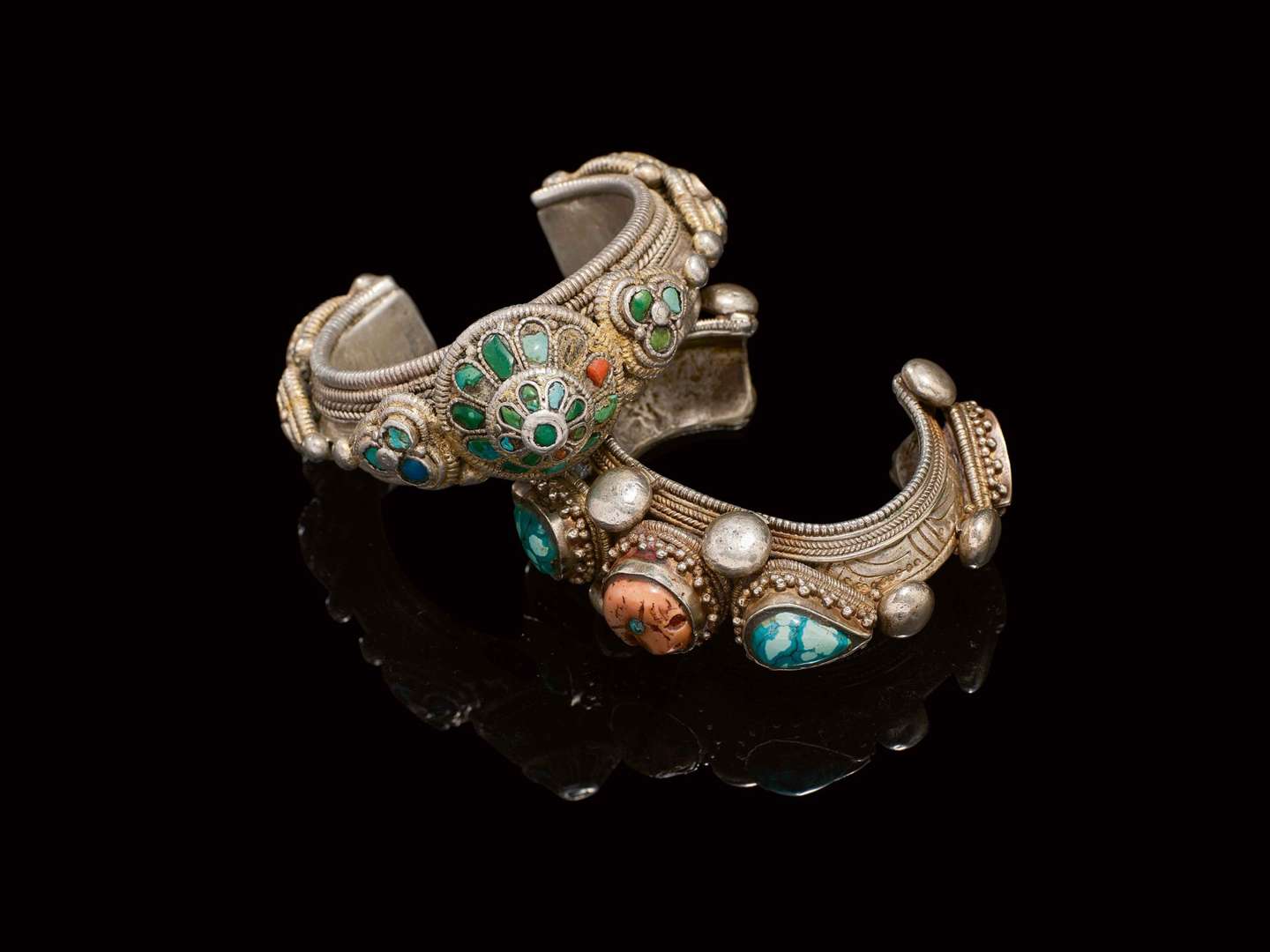 Ensemble de deux bracelets manchettes en argent et métal argenté rehaussés de cabochons de corail et pierres bleues.