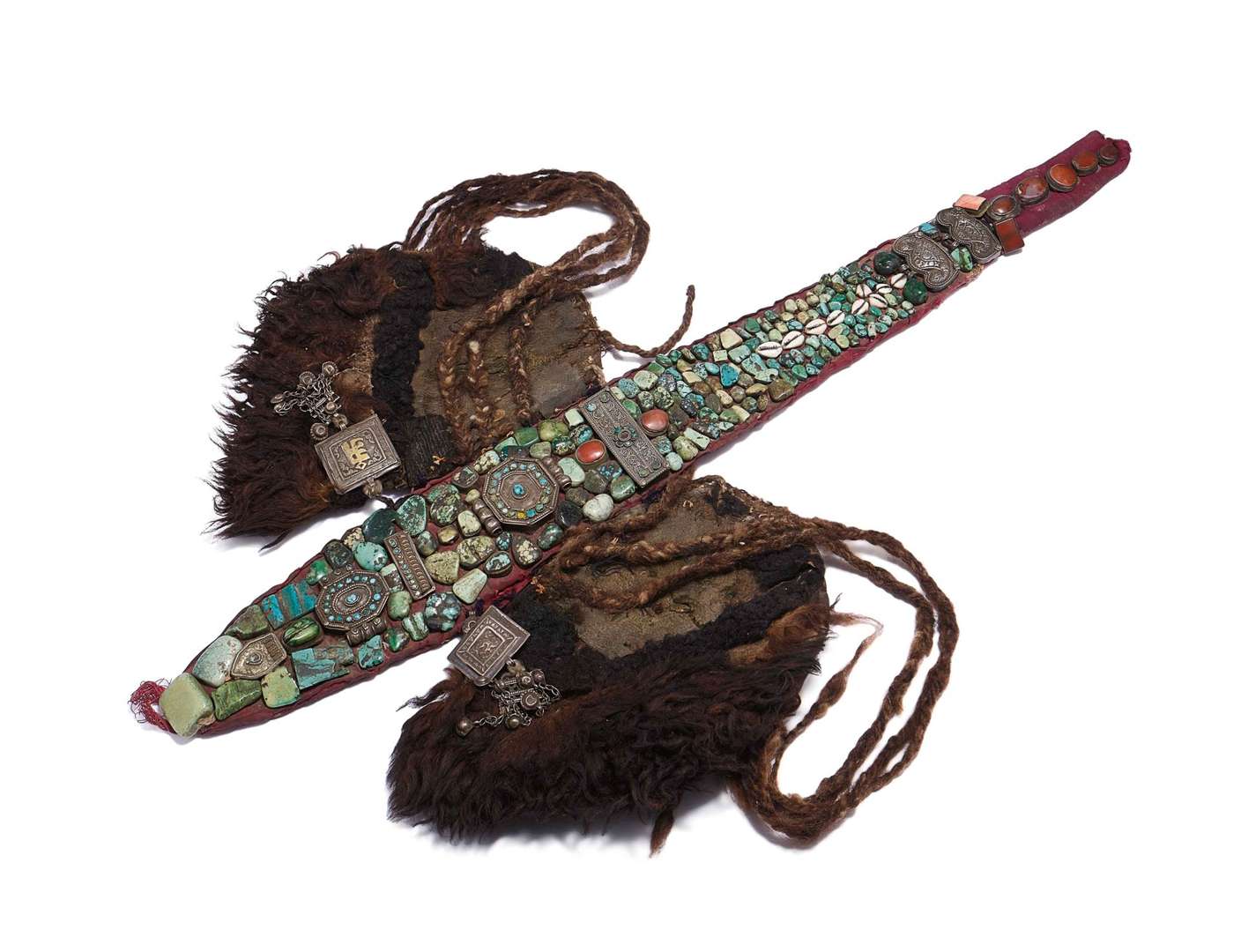 Ornée d'importants cabochons de turquoise, de cornaline et éléments filigranés appliqués une base textile. L'ensemble rehaussé de parties en cuir et laine animale.