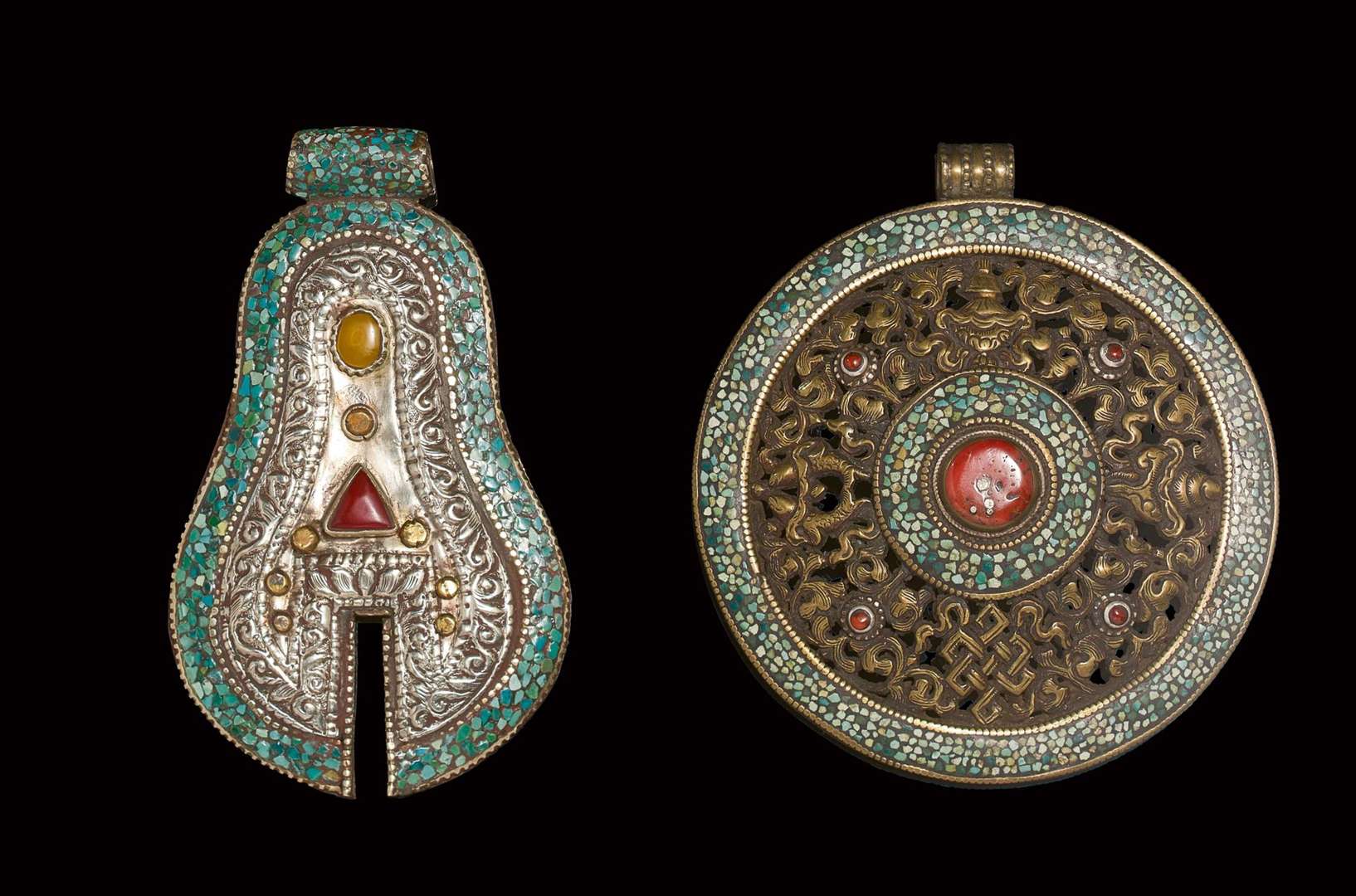 Ensemble de deux pendentifs incrustés de turquoise et corail.