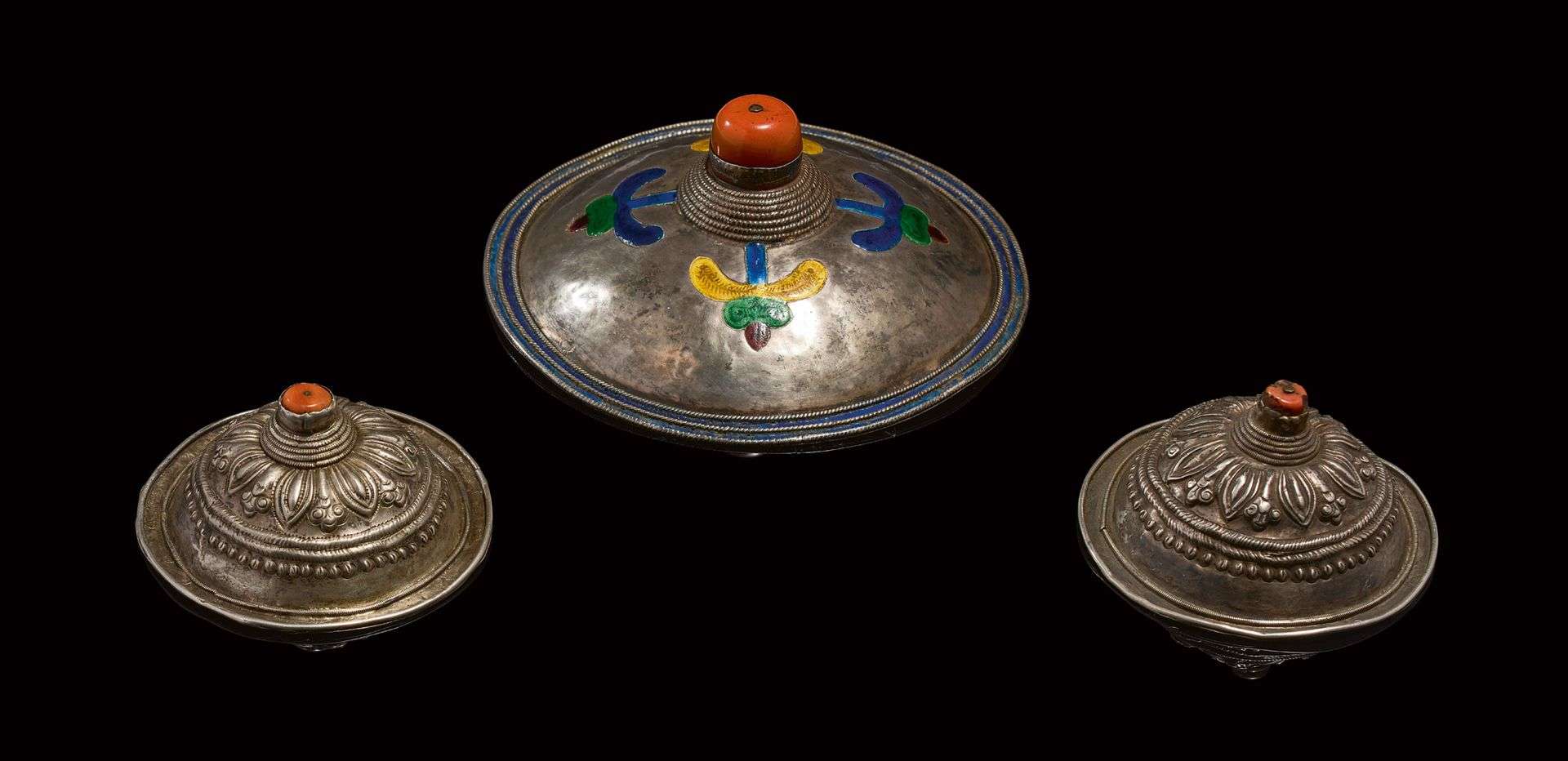 Ensemble de trois ornements de tête en argent, métal et corail.