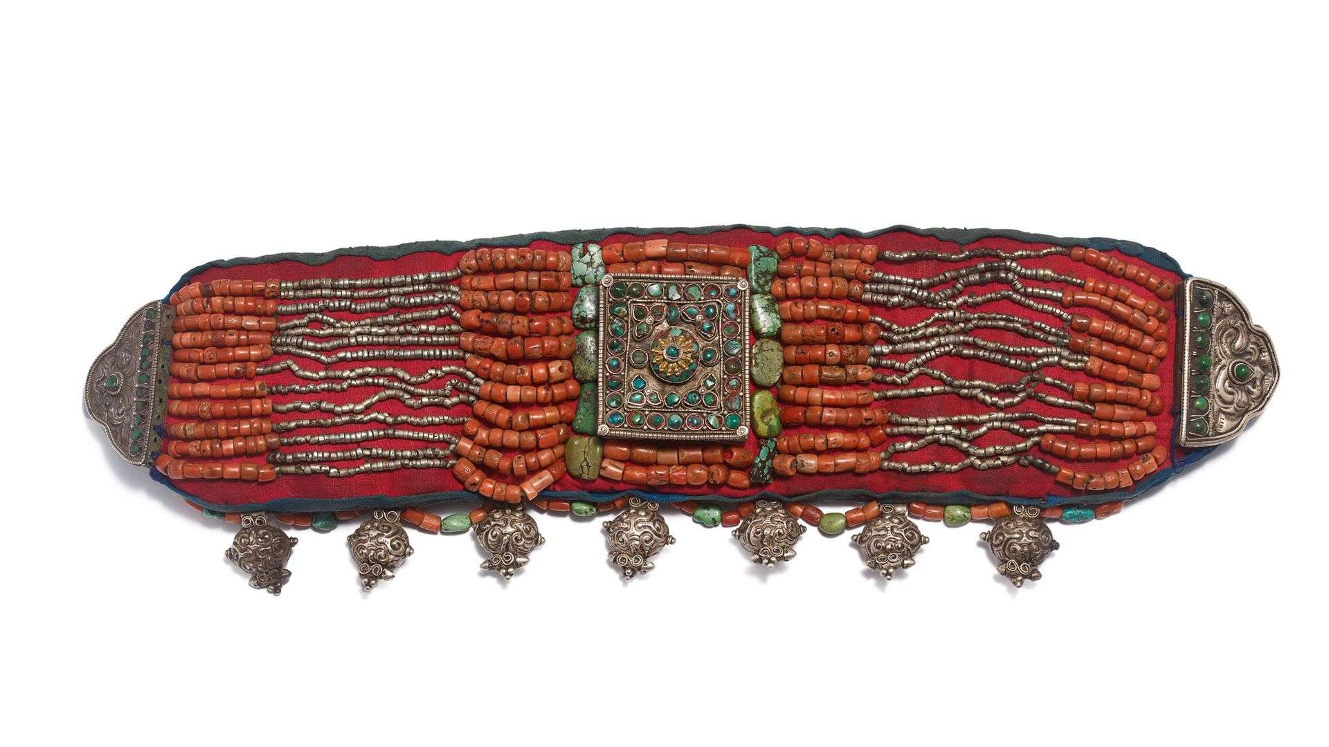 Le centre avec un médaillon carré, entouré d'un perlage de corail et cabochons de turquoise. L'ensemble souligné de sept pendeloques en forme de ga'u.