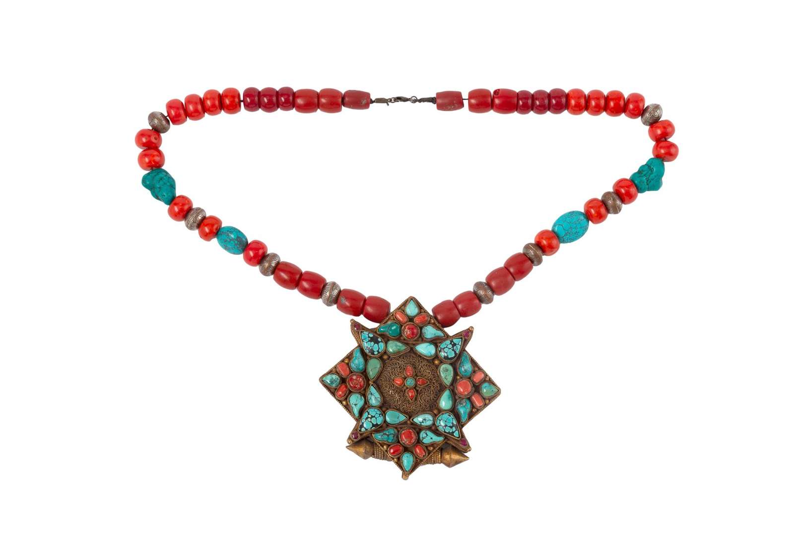 Collier de perles rouge et turquoise avec une boîte amulette en forme de mandala.