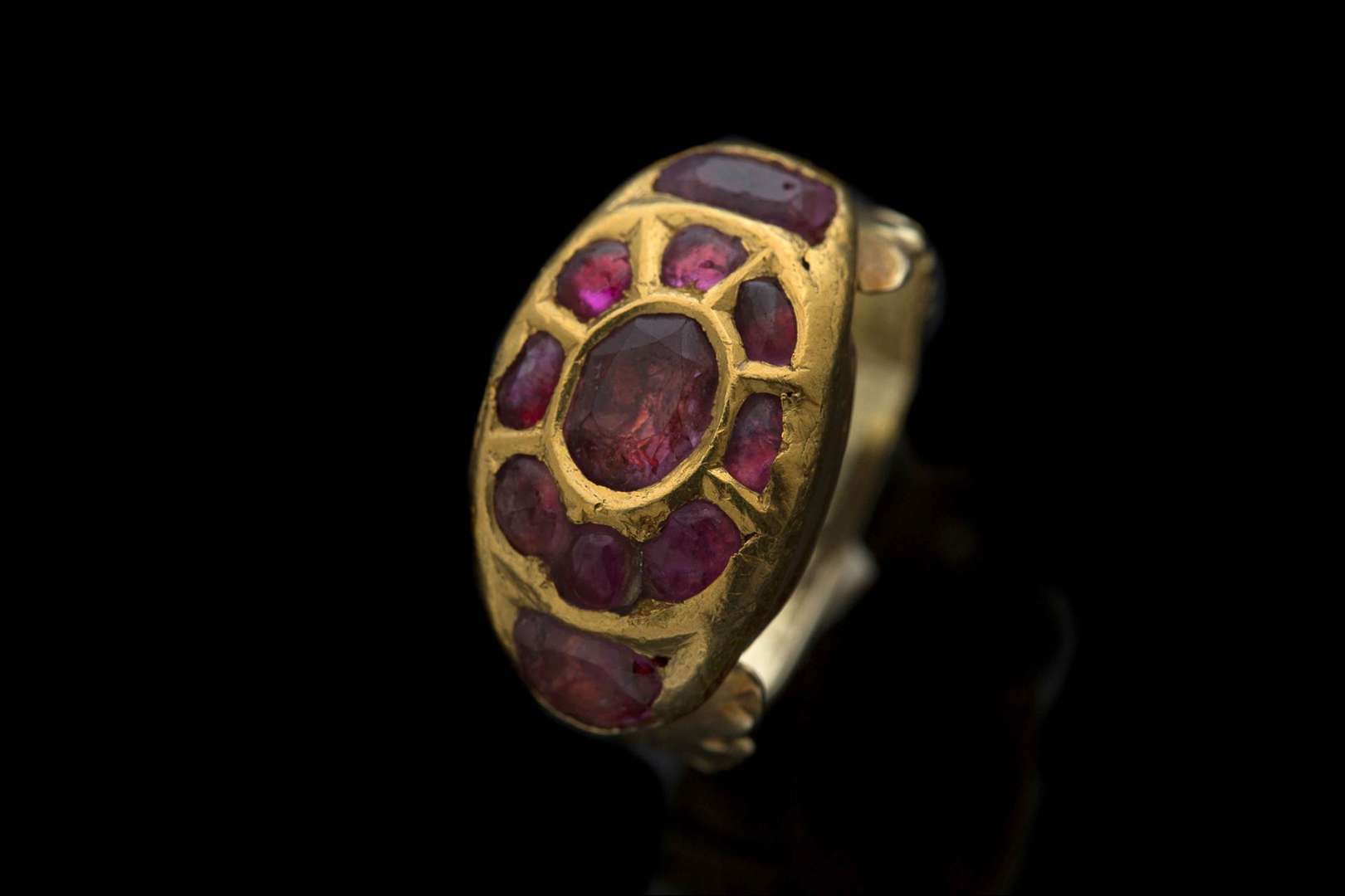 Le chaton en or 9k possiblement incrusté de rubis, l'anneau souligné de palmettes.