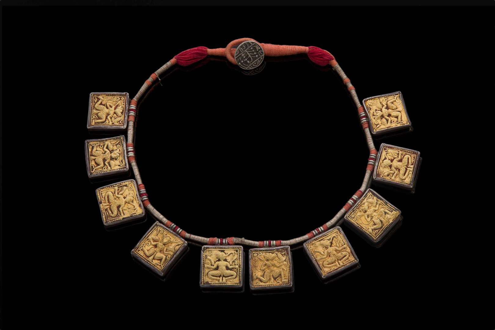 Formé de dix plaques carrées talismaniques à décor repoussé de divinités dont Ganesh, sur un cordon en passementerie.
