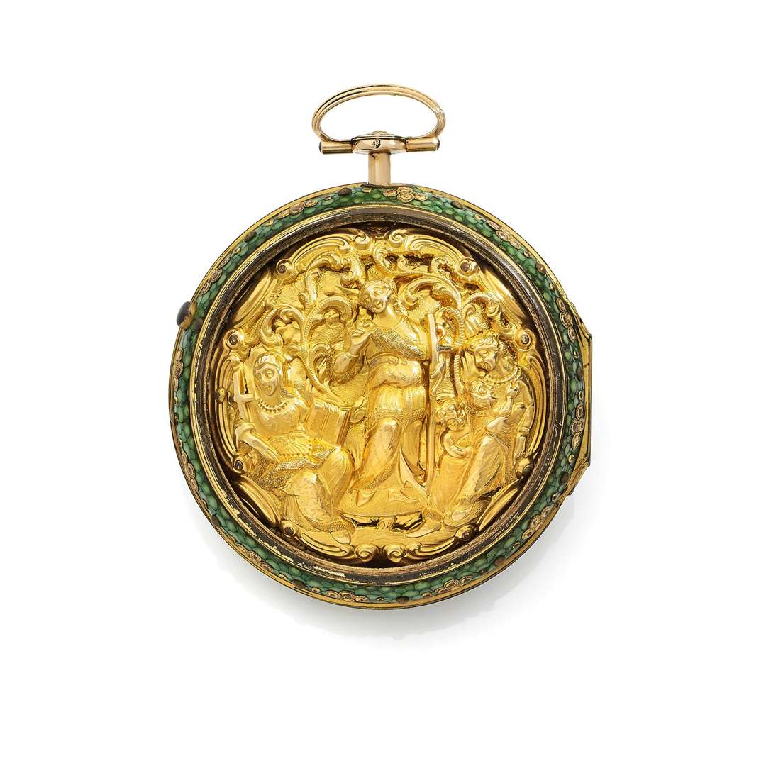 Boîtier extérieur : sur charnière ciselée et percée avec une décoration repoussée à motif d'une scène biblique agrémentée d'un décor de volutes en relief, la carrure avec des fleurs et motifs feuillagés