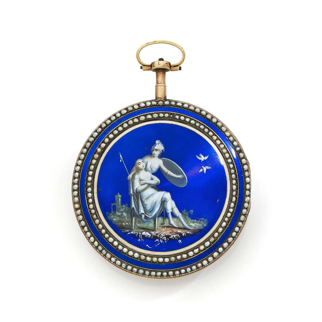 Boîtier : rond sur charnière, le dos avec un émail translucide bleu et une scène à l'antique en grisaille au centre, double entourage de demi-perles sur le pourtour recto et verso, la bélière numérotée