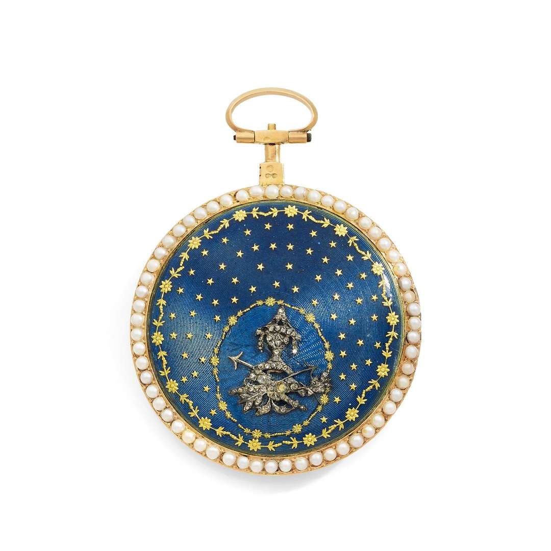 Gold and enamel watch with pearl-set decoration