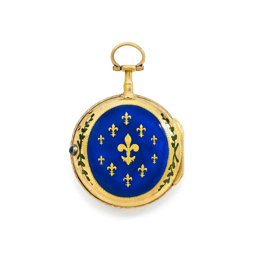 Boîtier : rond sur charnière, le dos décoré d'un émail peint sur fond bleu à motifs de fleurs de lys, la carrure décorée de motifs stylisés en relief