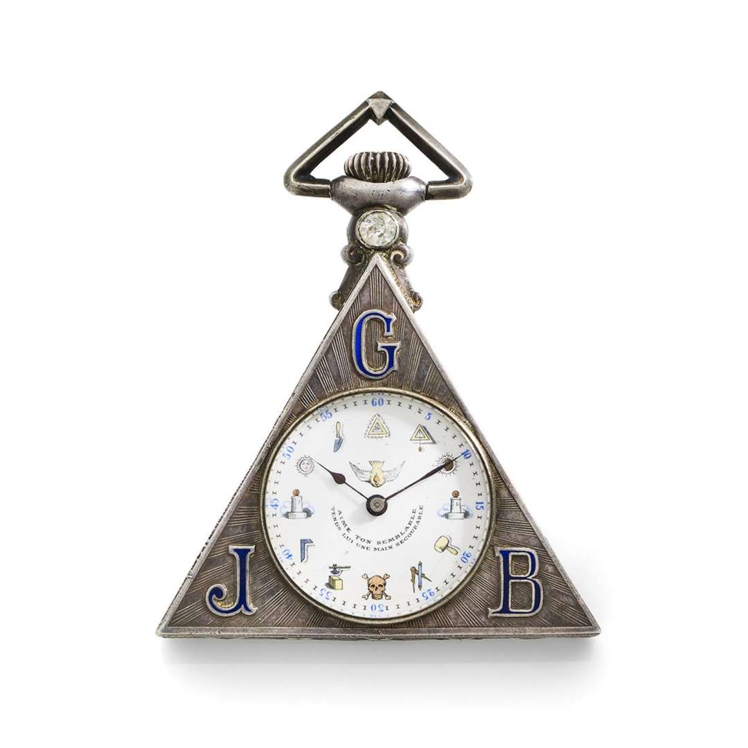 Boîtier : de forme triangle sur charnière, l'ensemble décoré des attributs de la franc-maçonnerie au dos et sur la tranche avec des initiales « GJB » en émail bleu sur le recto, une pierre blanche sous le pendant, signé « Tempor Watch Co Schwab-Loeille Genève »
