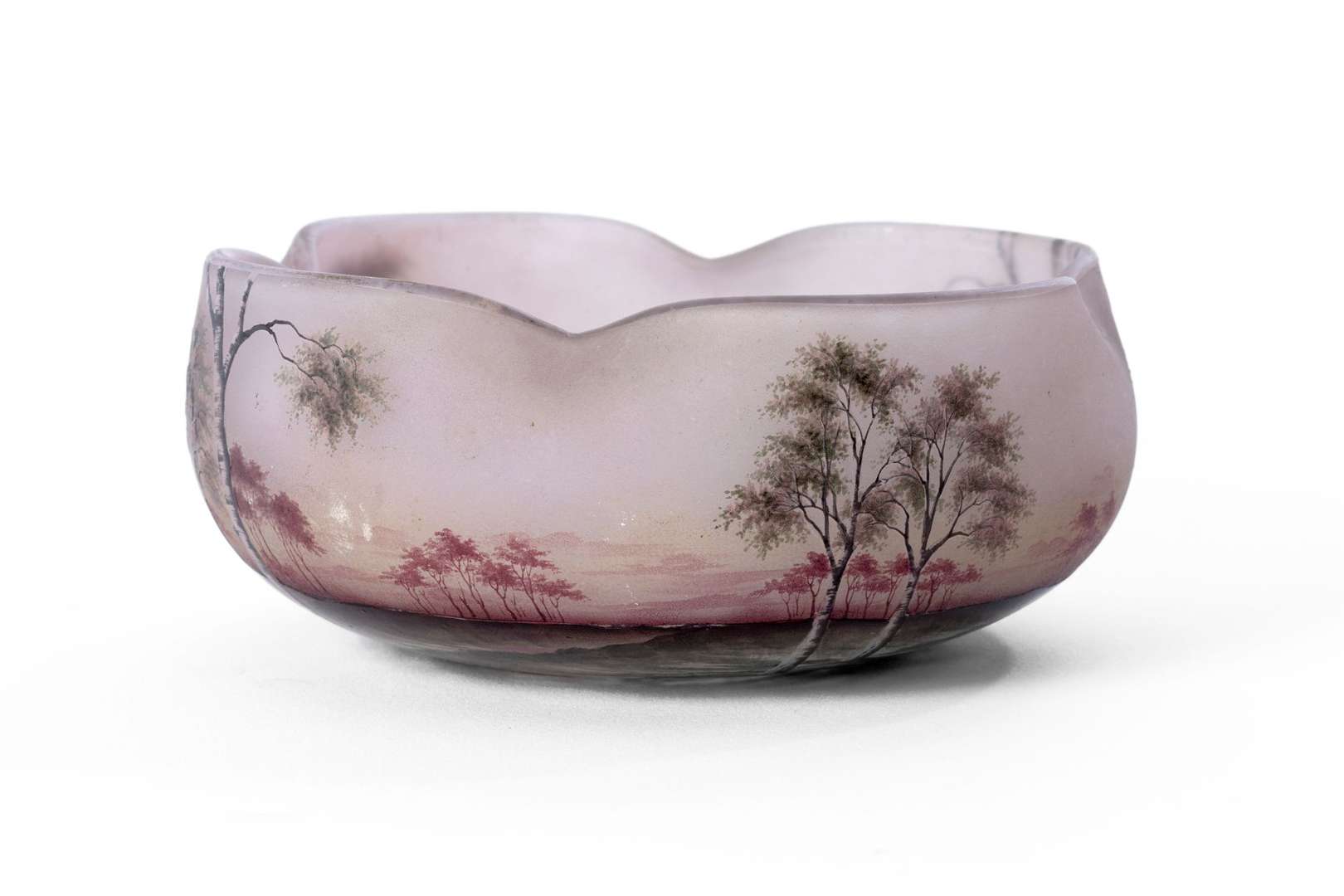 En verre mutlicouche violet, à décor gravé à l'acide et émaillé polychrome d'un paysage vosgien.