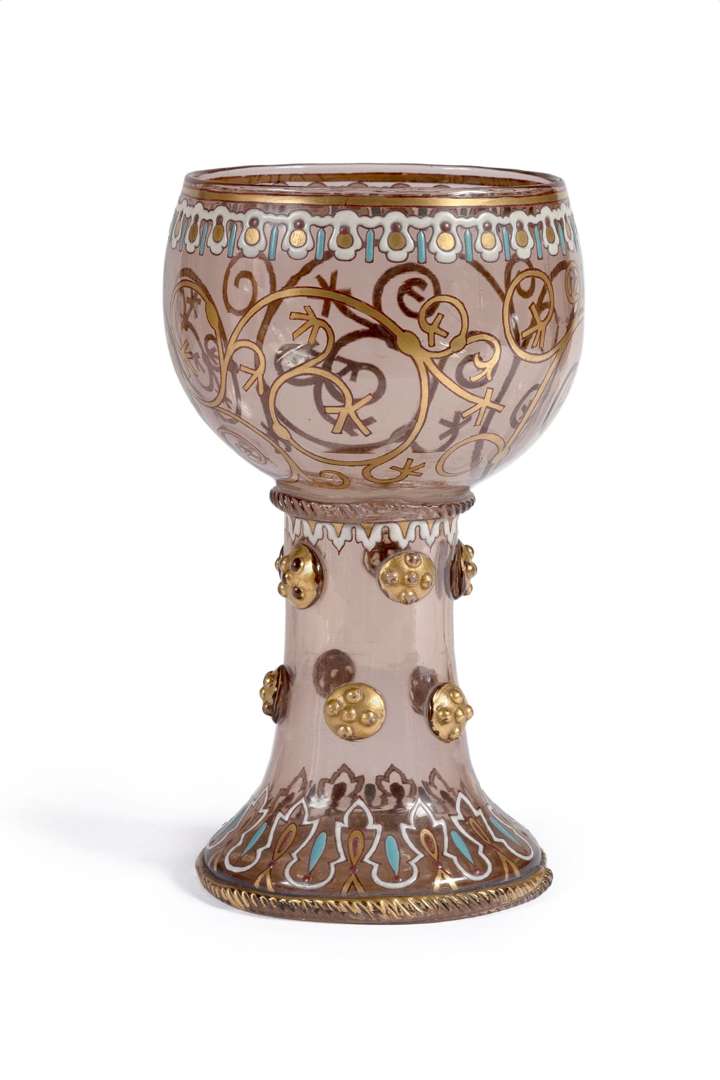 En verre teinté brun, à décor émaillé or, blanc et bleu ciel, le pied orné de pastilles dorées appliquées à chaud.