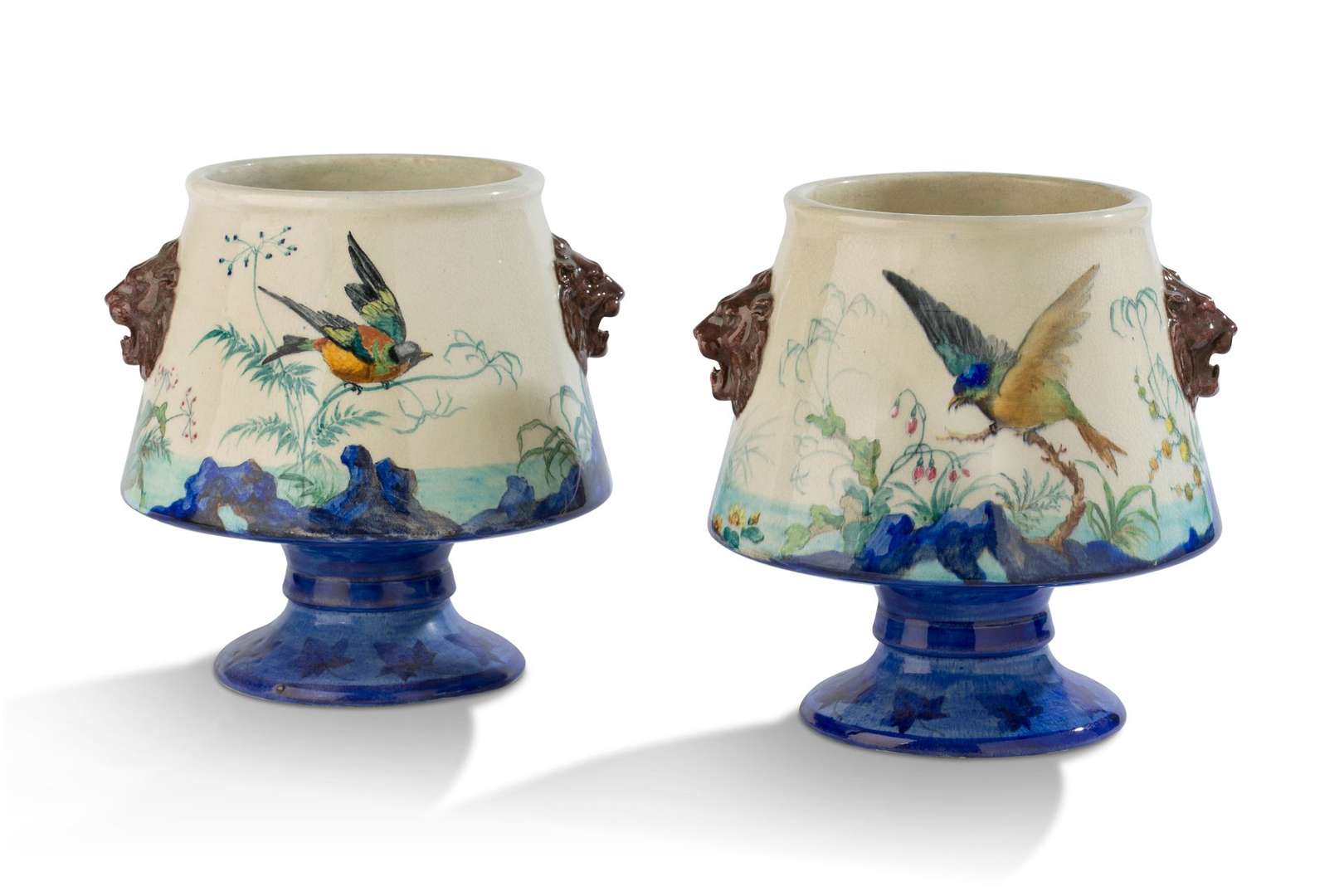 De forme tronconique sur piédouche, en faïence émaillée, le corps à décor polychrome de mésanges dans un paysage lacustre, flanqué de prises latérales formant mufles de lion.