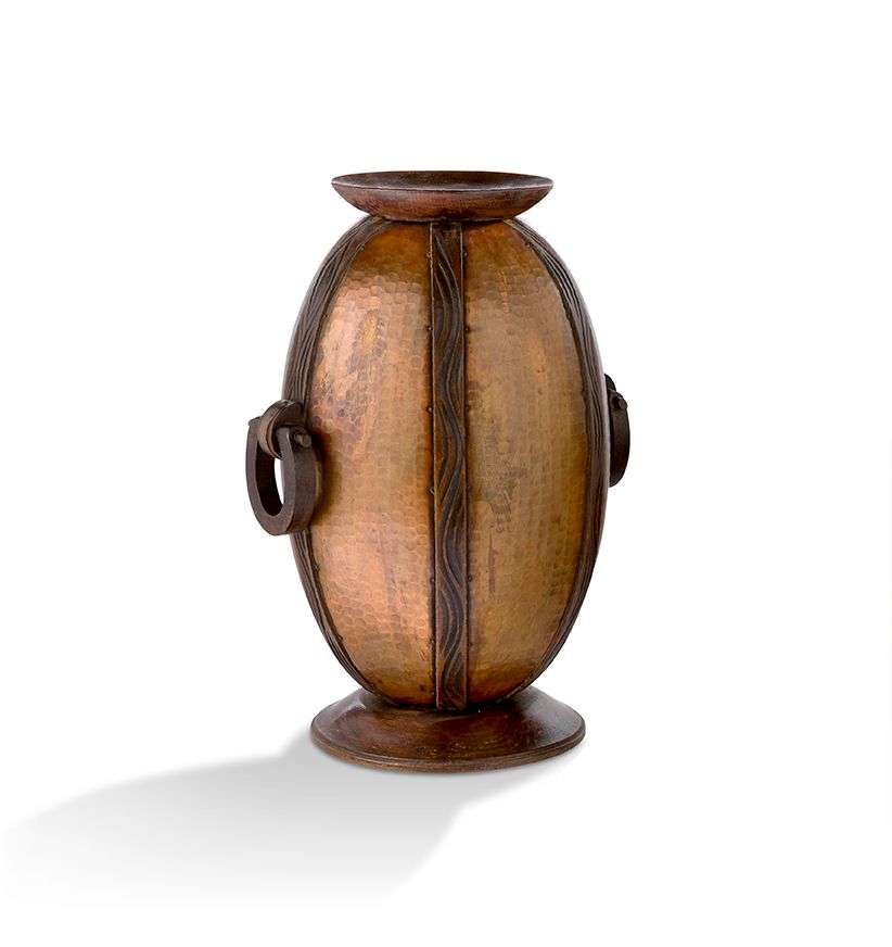 En dinanderie de feuilles de cuivre martelé, ornées de bandes verticales de bois cintré verni à décor de motifs abstraits, le corps flanqué de deux anses latérales mobiles en bois verni, intérieur en zinc.