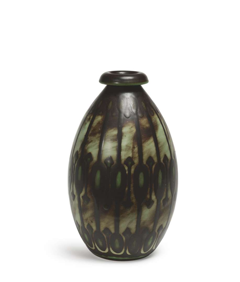 En grès à col ourlé, décor émaillé D1000 de frises d'ovales et de flèches, émaux verts et bruns sur fond beige nuancé brun.