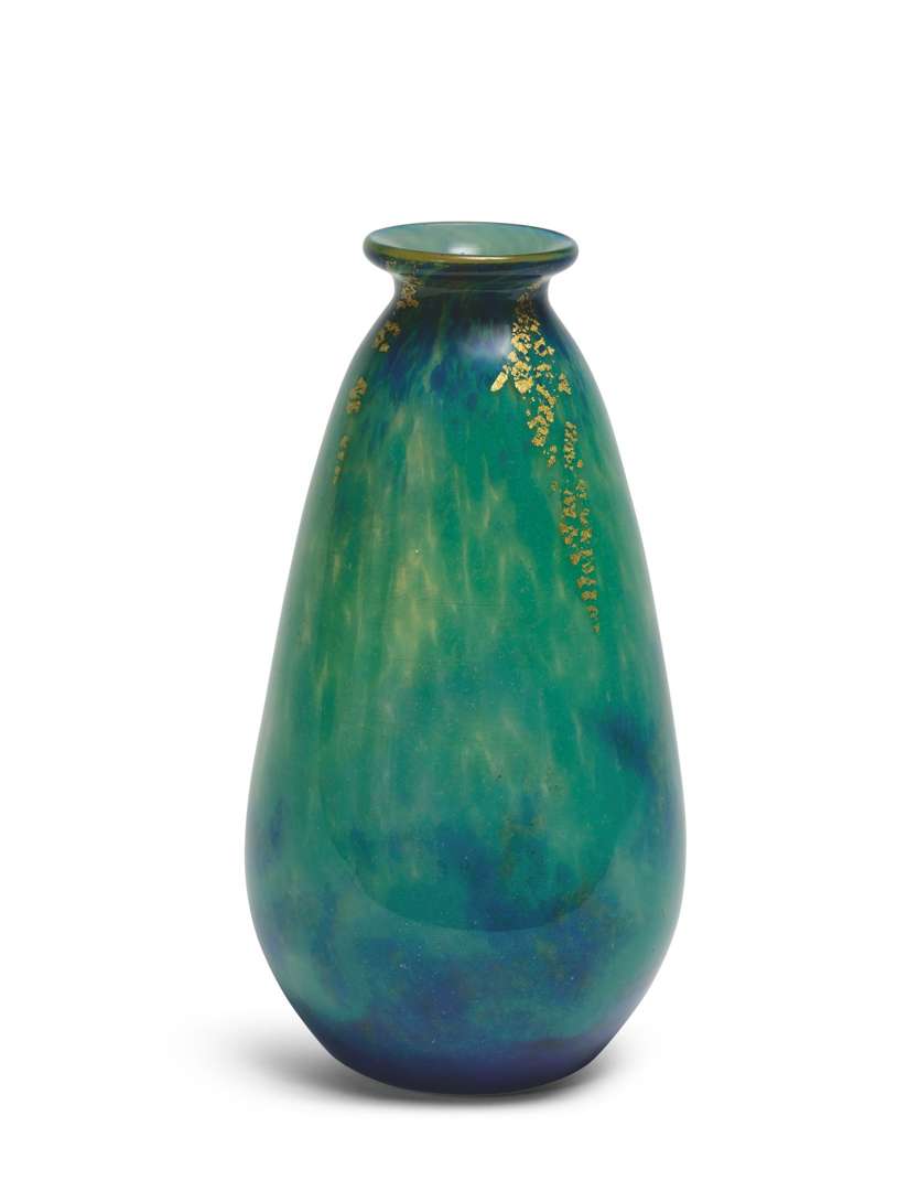 En verre marbré, tons bleu lagon et bleu roi, à inclusions de paillons dorés.