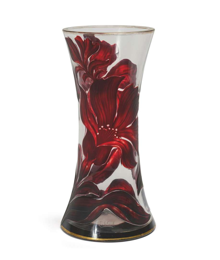 En verre multicouche rouge sur fond translucide, décor dégagé à l'acide de fleurs pourpres, le col et la base émaillés de filets or.