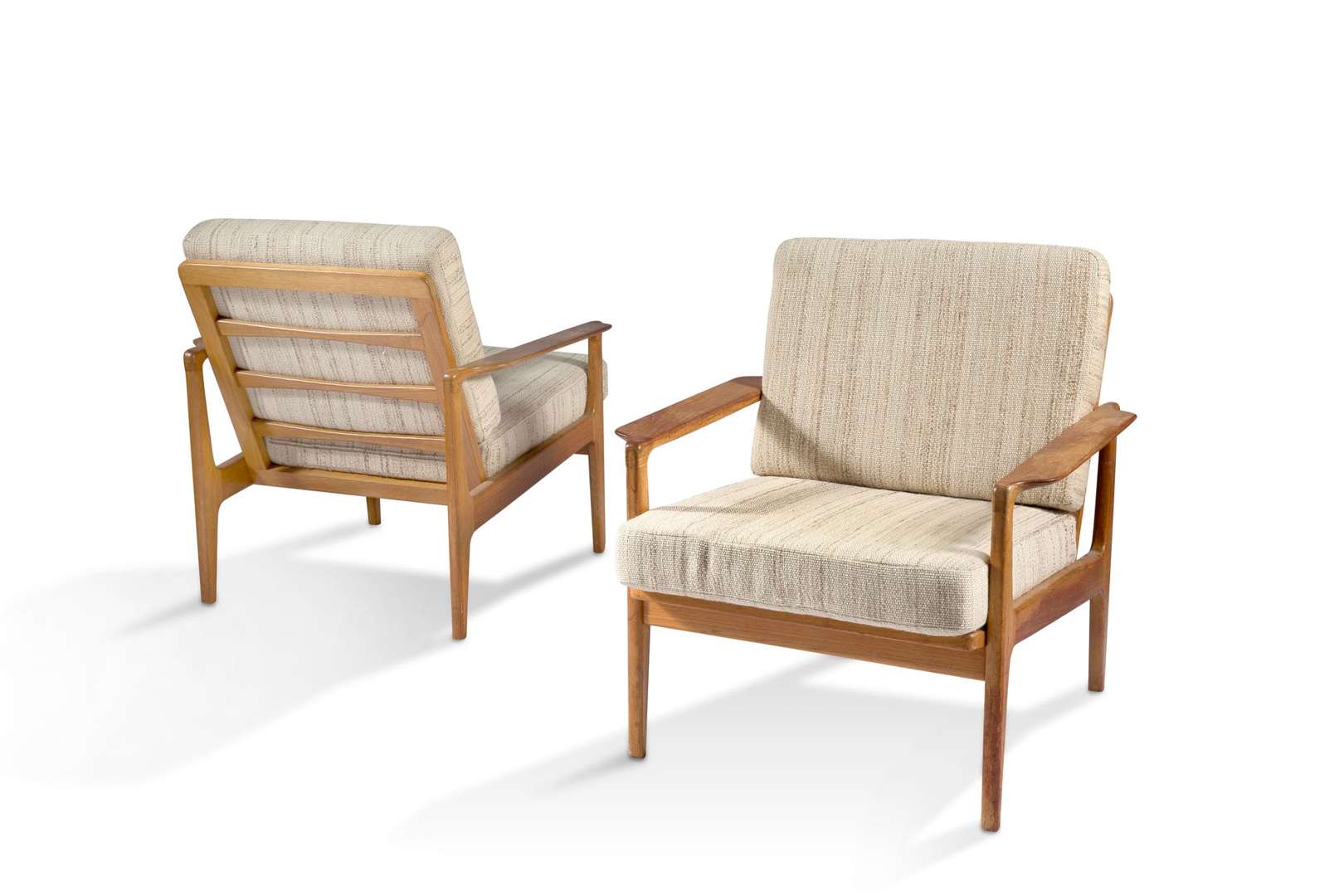 En teck, à structure méplate, comprenant un canapé et deux fauteuils, munis de coussins d'assise et de dossier recouverts de lainage beige (un coussin en tissu différent).