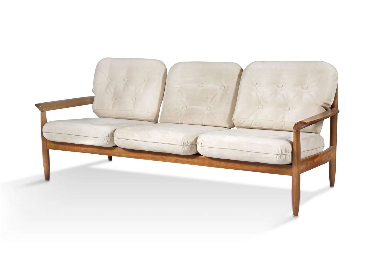 En teck, à structure méplate, comprenant un canapé et deux fauteuils, munis de coussins d'assise et de dossier recouverts de suédine blanche, et une table basse rectangulaire reposant sur un piètement à entretoise en H.
