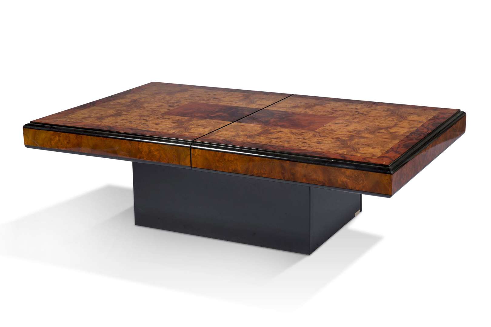 Plateau rectangulaire coulissant en placage de loupe, révélant un intérieur de rangement gainé de miroir, base rectangulaire en bois laqué noir.