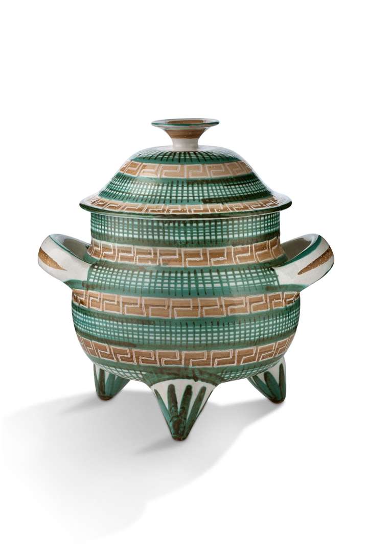 En faïence émaillée, à décor de frises géométriques, teintes vertes et brunes sur fond blanc, la panse flanquée de deux anses latérales, reposant sur un piètement tripode.
