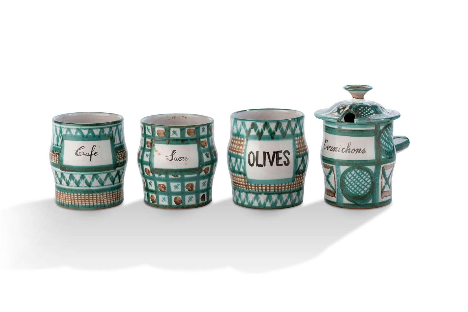 À cornichons, à olives, à café et à sucre, l'un couvert, en faïence émaillée, à décor géométrique vert et brun sur fond blanc.