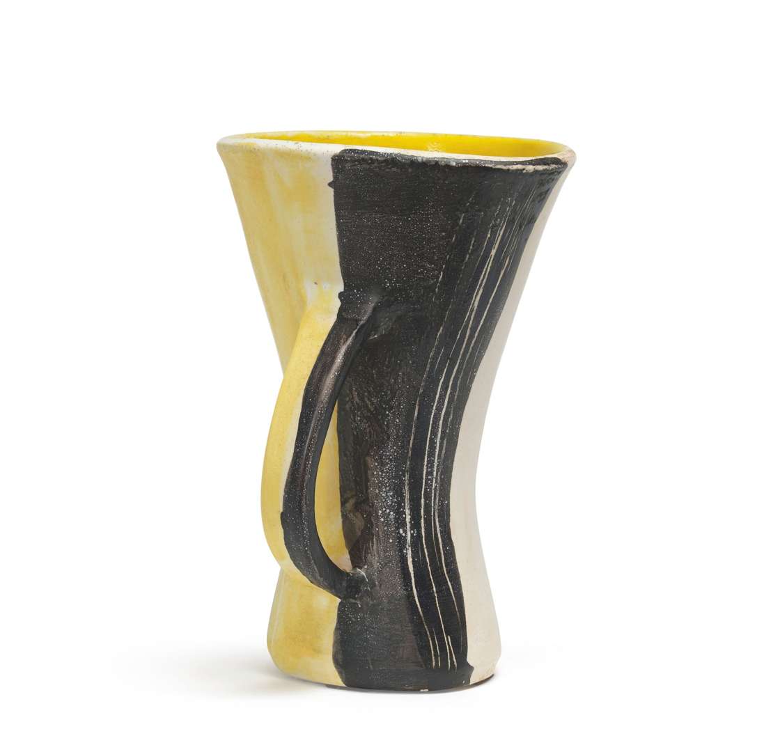 En faïence, à décor émaillé de larges bandes jaunes et noir mat sur fond blanc nuancé beige, intérieur émaillé jaune.