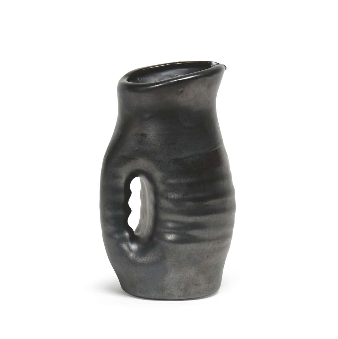 En faïence émaillée noir à reflets métalliques, le corps et la anse cannelés.