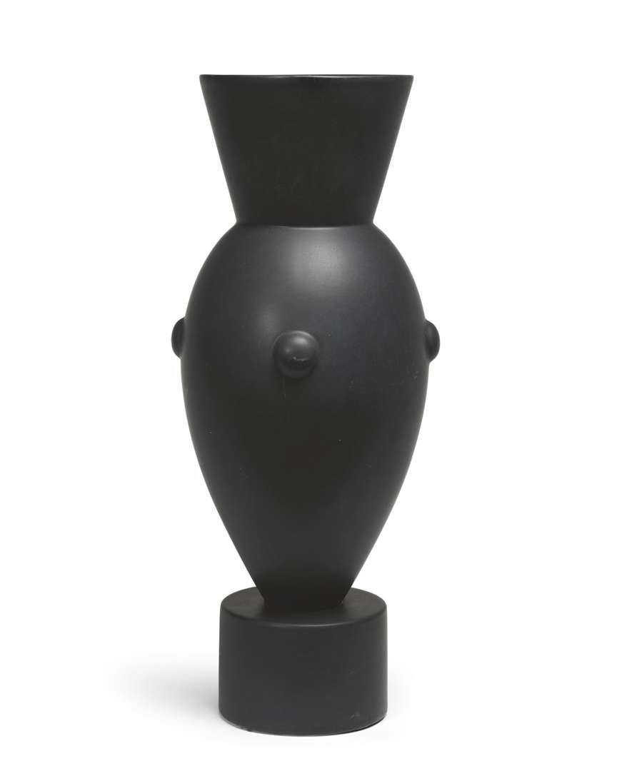 De forme ovoïde, à haut col évasé, base cylindrique, en faïence émaillée noir mat.