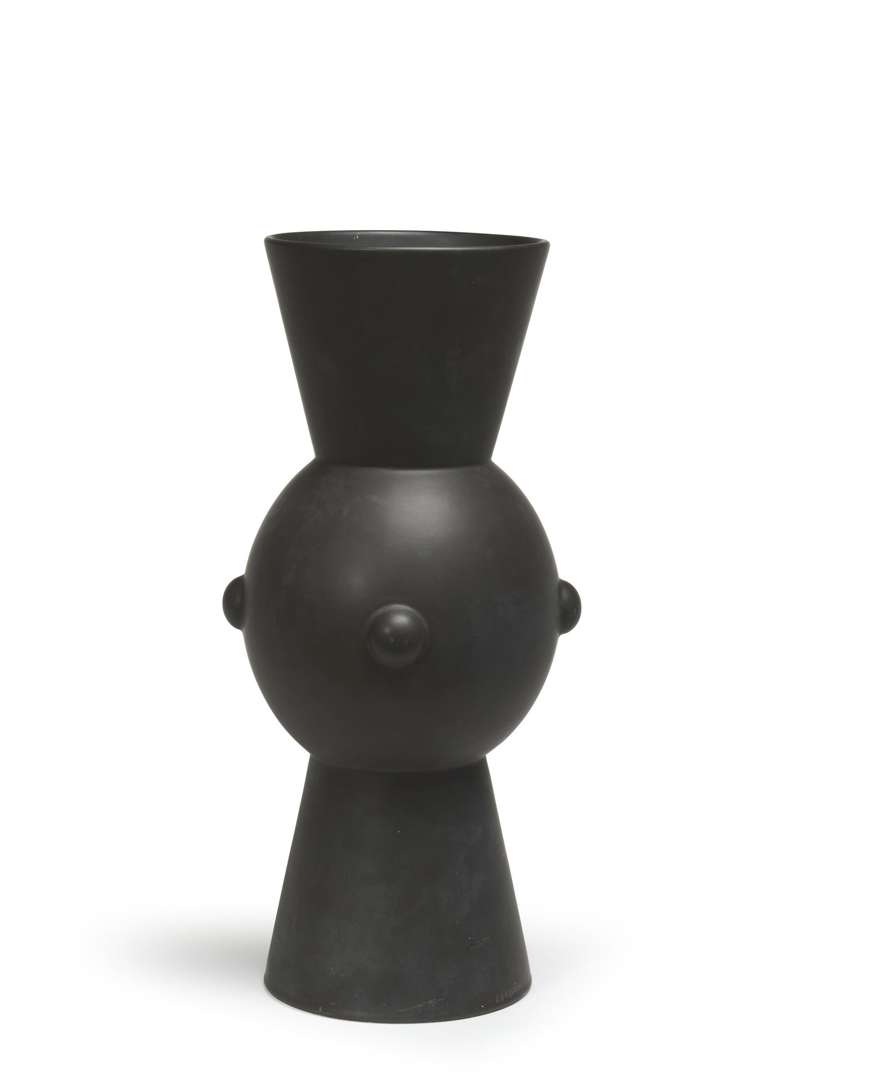 Le col et la base évasés, la panse sphérique à décor de pastilles, en faïence émaillée noir mat.