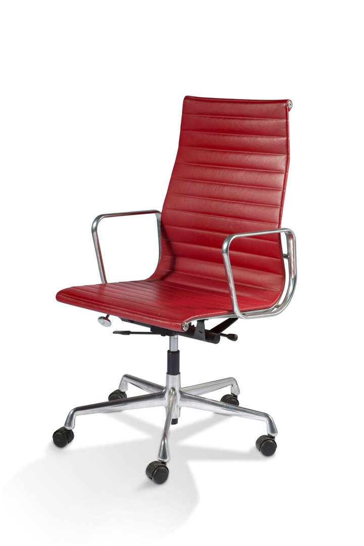 Structure en acier chromé, piètement cruciforme se terminant par des roulettes, assise et dossier recouverts de cuir rouge.